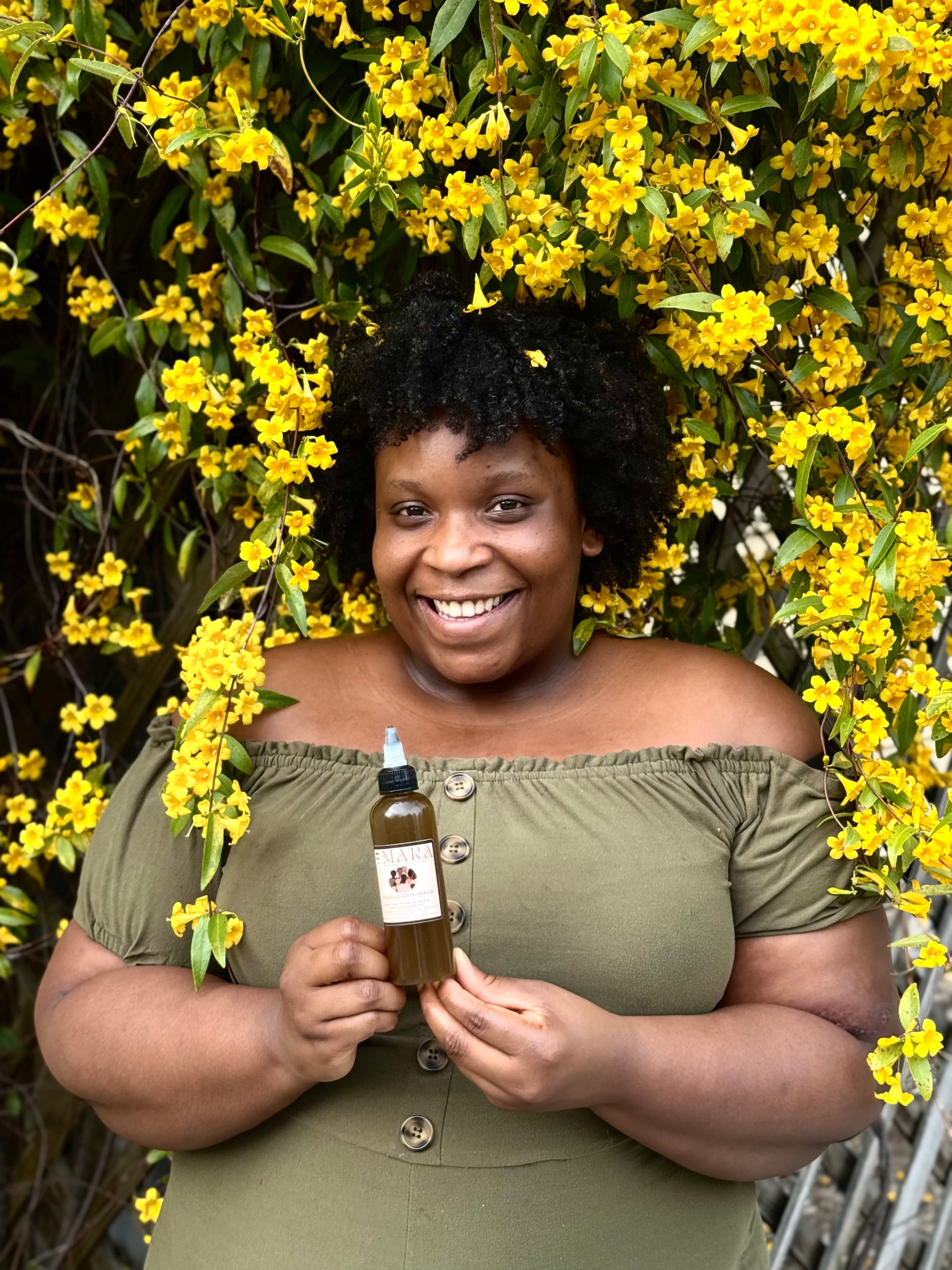 The organic fenugreek seeds and neem, freshly grown in India, as well as the organic hibiscus, sourced from Africa, have been soaking in oil for a minimum of 40 days. The nutrients from the raw ingredients are absorbed through the oil, creating a strengthing hair oil. Hibiscus contains an amino acid called keratin which helps treat dry scalp and prevent breakage.